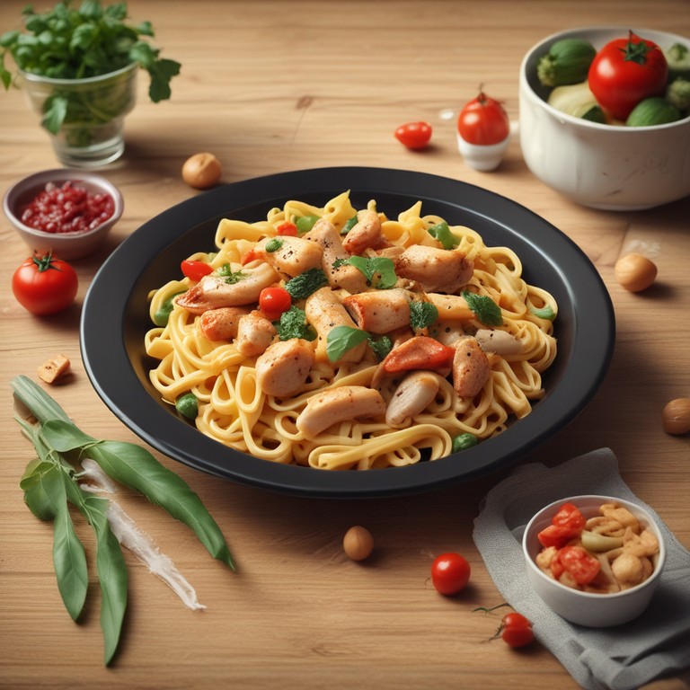 Этот рецепт итальянской пасты с курицей и овощами прекрасно сочетает в себе ароматы базилика, сладкого перца и чеснока. Блюдо получается насыщенным и вкусным, идеальным для ужина в кругу семьи.