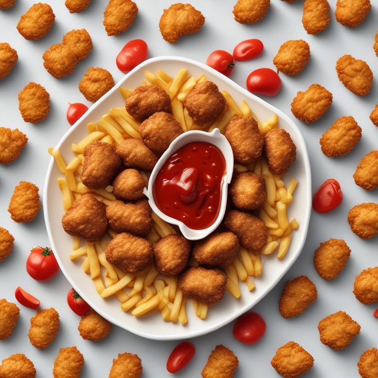 Ein einfaches und köstliches Gericht, das sowohl Kinder als auch Erwachsene lieben werden. Die knusprigen Dino Nuggets werden mit Pommes, einer cremigen Tomatensauce mit Jagdwurst und Nudeln serviert. Perfekt für eine schnelle und leckere Mahlzeit.