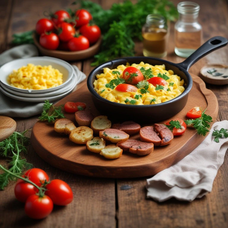 Это простое и сытное блюдо идеально подходит для завтрака или обеда. Яичница с помидорами, колбасой и картофелем сочетает в себе множество вкусов и текстур, делая его любимым у всей семьи.