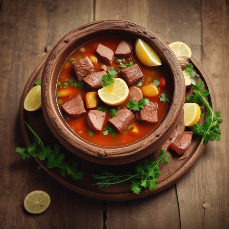 Solyanka is a traditional Russian soup known for its rich and tangy flavor, made with a variety of meats, pickles, and spices. This hearty dish is perfect for warming up on a cold day and is often served with sour cream and lemon for added zest.