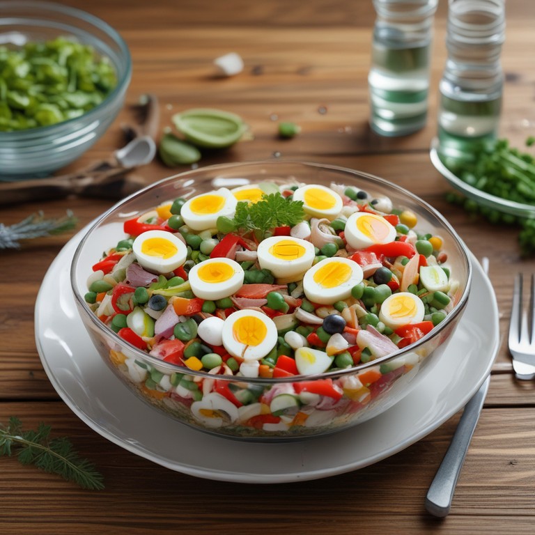 Этот салат сочетает в себе нежный вкус сельди и крабовых палочек с ярким зеленым горошком и яйцами, создавая идеальное блюдо для праздничного стола.