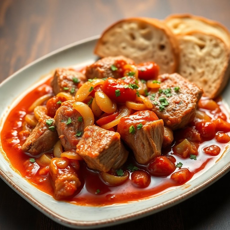 Это блюдо представляет собой нежное мясо, приготовленное в ароматном томатном соусе с луком и чесноком. Идеально подходит для настоящих гурманов, оно сочетает в себе насыщенные вкусы и ароматы, которые порадуют вас и ваших близких.