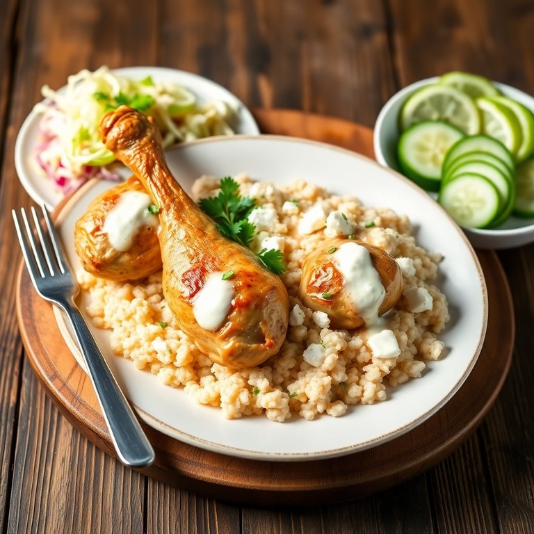 Нежные куриные ноги, запеченные в ароматном соусе из сметаны и брынзы, подаются с рассыпчатой гречкой и свежими овощами.