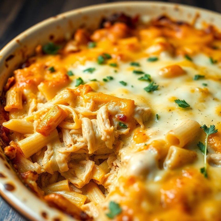 Un cremoso plato de pasta gratinado con pollo y un toque de queso crema, perfecto para una cena familiar.