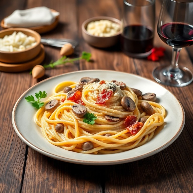 Сливочный соус с грибами и беконом придает этому блюду из макарон насыщенный вкус. Кетчуп добавляет пикантную сладость, а чеснок и петрушка усиливают аромат.