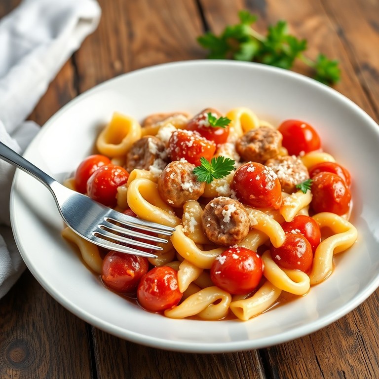 Макароны, обжаренные с сосисками и помидорами черри в сливочном соусе с добавлением тертого сыра пармезан. Простое и элегантное блюдо, готовое за 20 минут.
