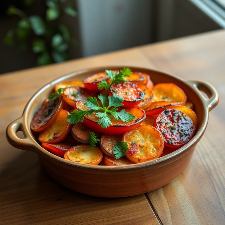 Красочное блюдо из картофеля и помидоров, запечённое с ароматными травами — идеально для лёгкого и сытного вегетарианского обеда.