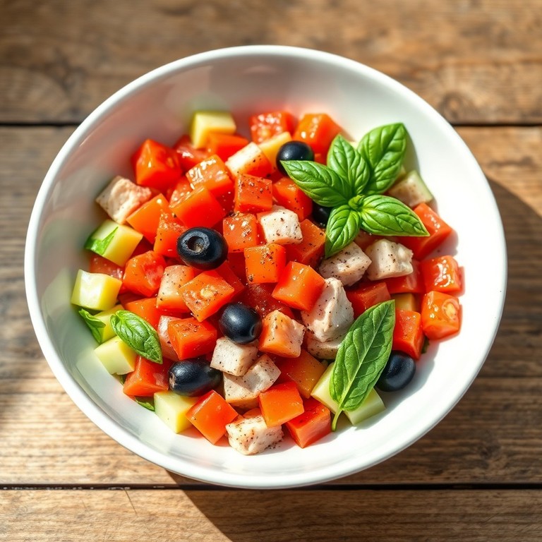 Легкий и освежающий средиземноморский салат с тунцом, огурцами и помидорами, заправленный оливковым маслом и лимонным соком. Идеально подходит для летнего обеда или легкого ужина.