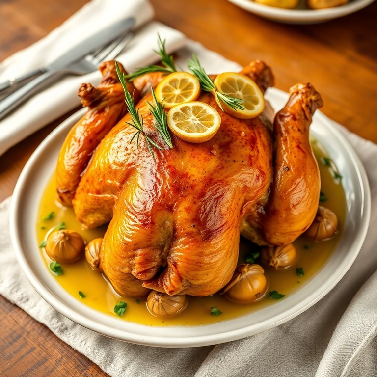 Un coquelet rôti au four parfumé au romarin frais et au citron, offrant une peau croustillante et une chair tendre et juteuse. Cette recette classique et conviviale est idéale pour un dîner chaleureux, accompagnée de légumes de saison ou d'une salade verte.