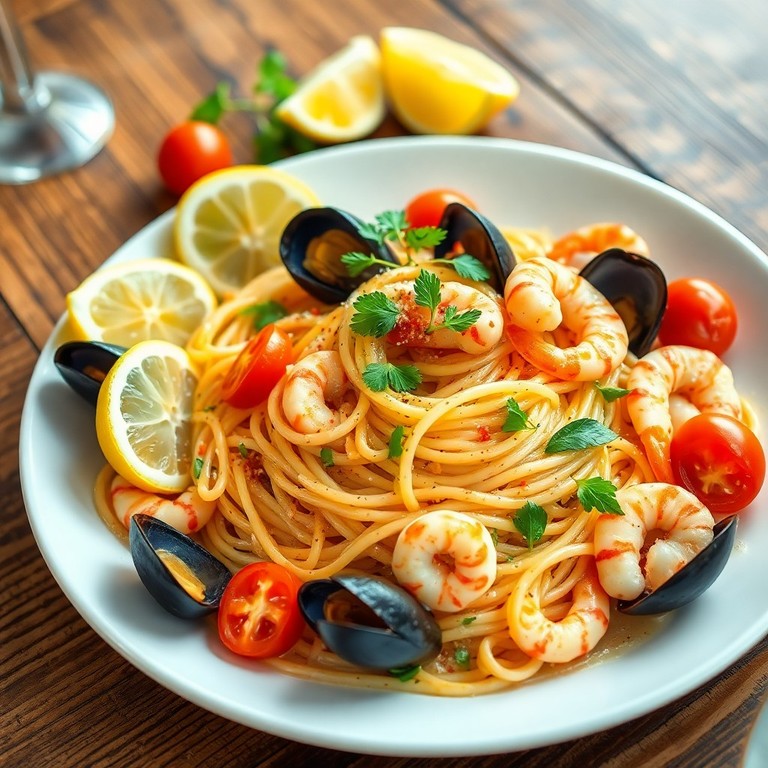 Классическое итальянское блюдо с нежными мидиями, кальмарами и вареными креветками, приготовленное в ароматном соусе из белого вина и чеснока. Идеально подходит для любителей морепродуктов, сочетая свежесть и насыщенный вкус.