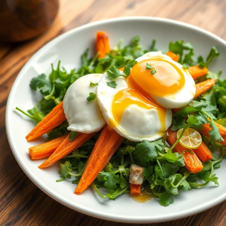 Una ensalada cálida y saludable que combina zanahorias al vapor, queso suave y huevos pochados con una vinagreta ligera, perfecta para un almuerzo ligero y nutritivo.