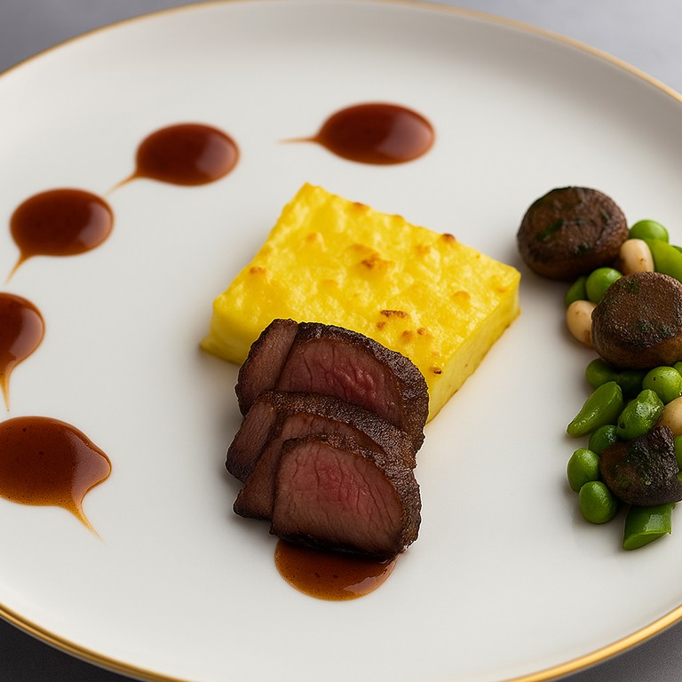 Carne de res con salsa de frutos rojos y guarnicion de habas y arvejas y papa gratinada