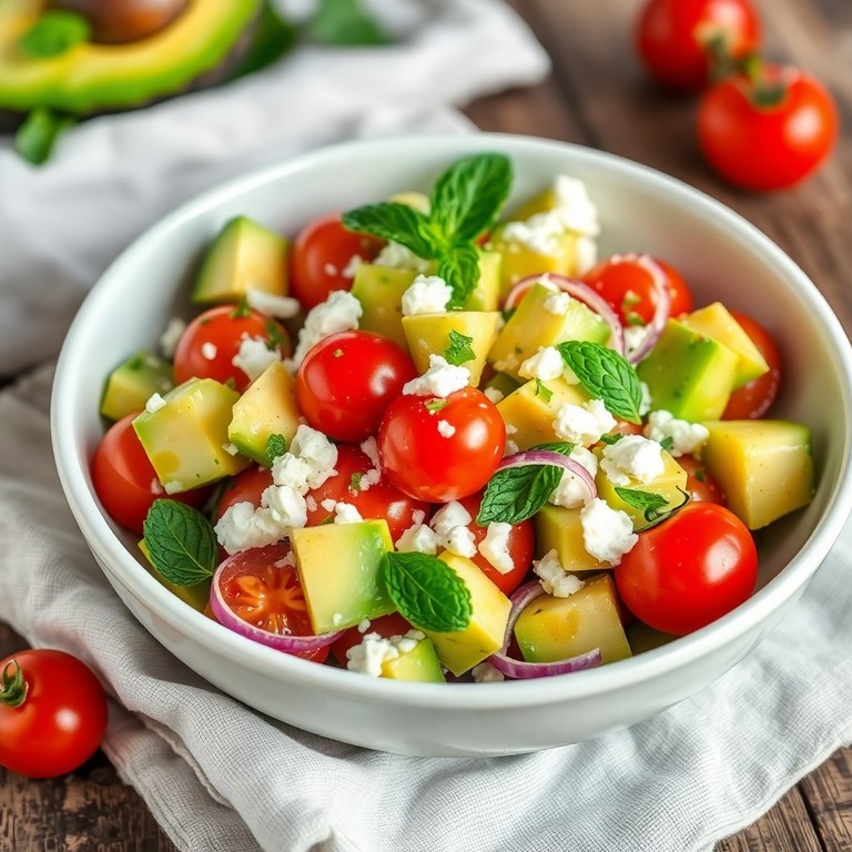 Une salade méditerranéenne fraîche et colorée combinant avocat crémeux, tomates cerises juteuses, oignon rouge croquant, feta salée et menthe parfumée. Parfaite pour un déjeuner léger et sain, cette recette simple met en valeur des ingrédients frais et une vinaigrette citronnée.