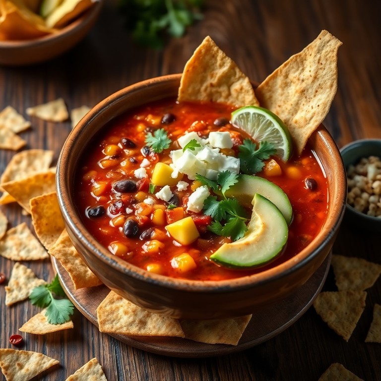 This vibrant soup brings together the smoky heat of chipotle peppers, roasted tomatoes, and a medley of classic Mexican flavors. Crispy homemade tortilla strips add crunch, while fresh toppings like avocado, cilantro, and lime brighten every spoonful. Ready in just 30 minutes, this comforting dish is perfect for a quick weeknight meal with bold, satisfying flavors.