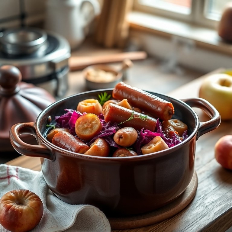 Классическое французское блюдо – поте из красной капусты с ароматными колбасками Монтбелиар, запечёнными с каштанами и яблоками. Медленное тушение делает его ароматным и сытным.