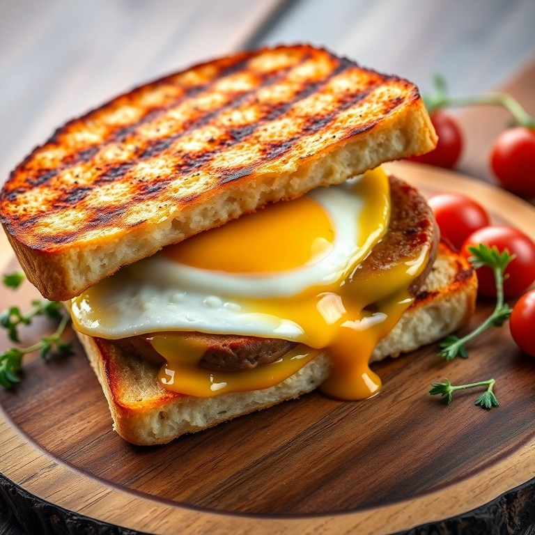 Ароматный и сытный гриль-сэндвич с расплавленным сыром, горячей яичницей и сочной колбасой — идеальный быстрый завтрак для настоящих гурманов. Этот рецепт сочетает в себе хрустящий поджаренный хлеб, нежный сыр и насыщенный вкус яиц и колбасы, позволяя начать день с удовольствия и энергии.
