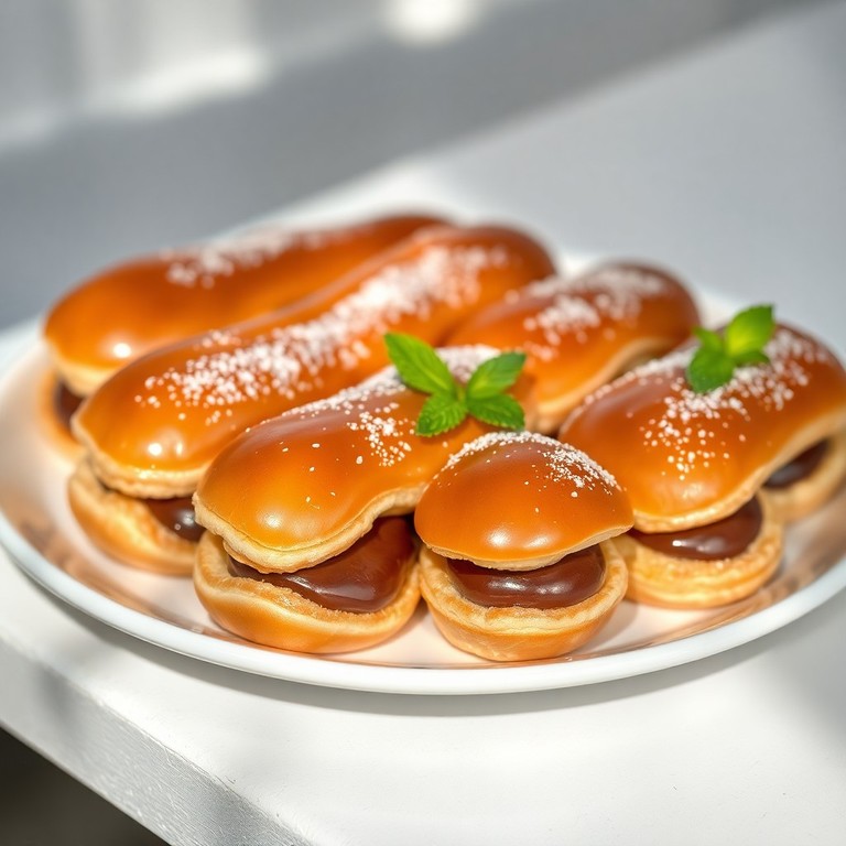Классические французские эклеры с воздушным заварным тестом, покрытые хрустящей карамельной корочкой и наполненные насыщенным шоколадным ганашем. Идеальное сочетание легкости и глубины вкуса для настоящих гурманов и любителей изысканных кондитерских изделий.