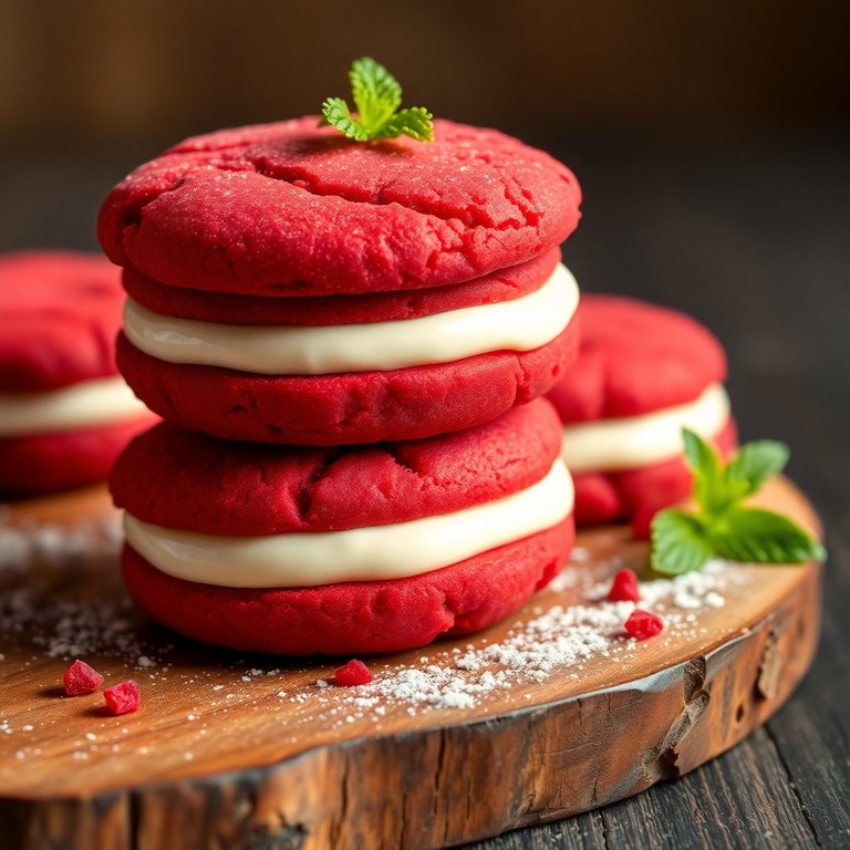 Deliciosas galletas de red velvet rellenas con un suave y cremoso queso crema, perfectas para un toque indulgente y elegante en cualquier ocasión especial o para consentirte en casa.