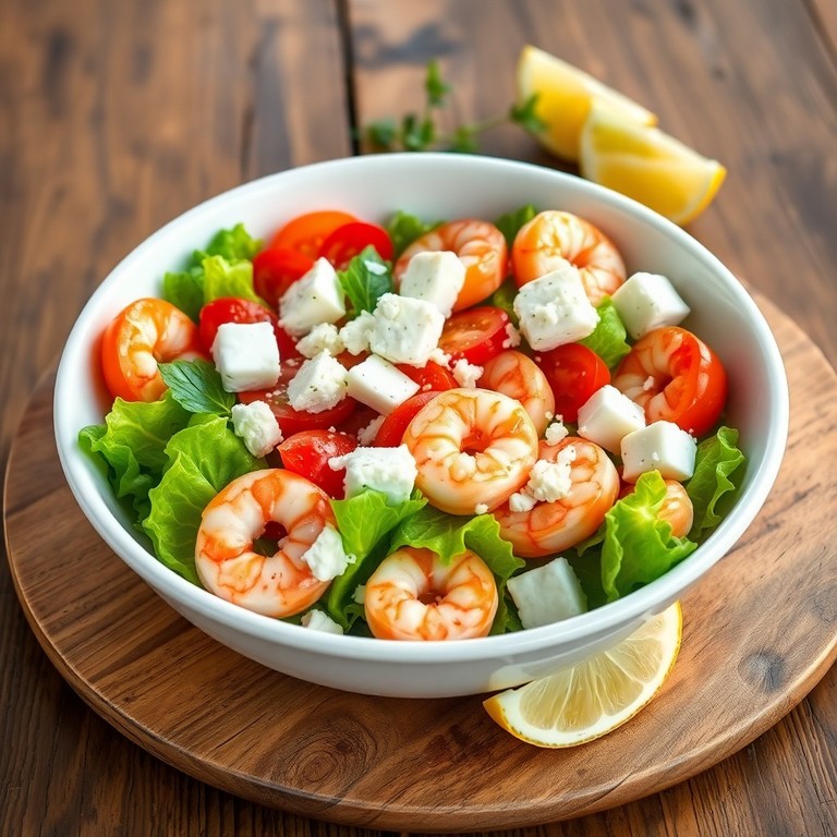 Свежий и лёгкий средиземноморский салат, идеально подходящий для жарких летних дней. В основе салата — хрустящие листья салата, сочные помидоры, нежные варёные креветки и солоноватый сыр фета. Заправка из оливкового масла с лимонным соком придаёт блюду яркий и освежающий вкус.