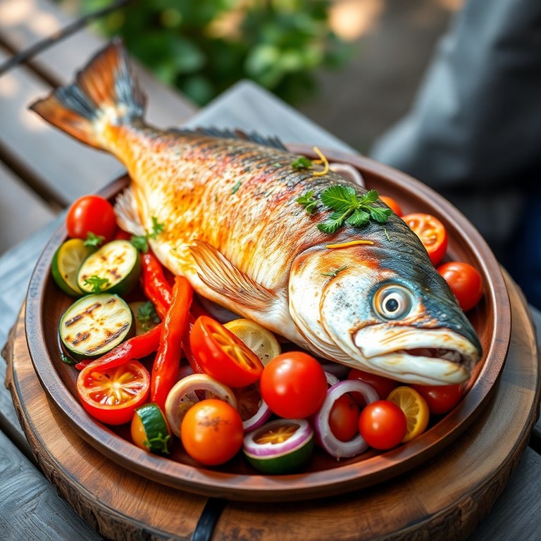 Свежий и легкий рецепт морской рыбы, приготовленной целиком на гриле с ароматным цитрусовым маринадом. Подается с ярким овощным гарниром, который подчеркивает вкус рыбы и добавляет свежесть блюду. Идеально подходит для летнего обеда или ужина на свежем воздухе.