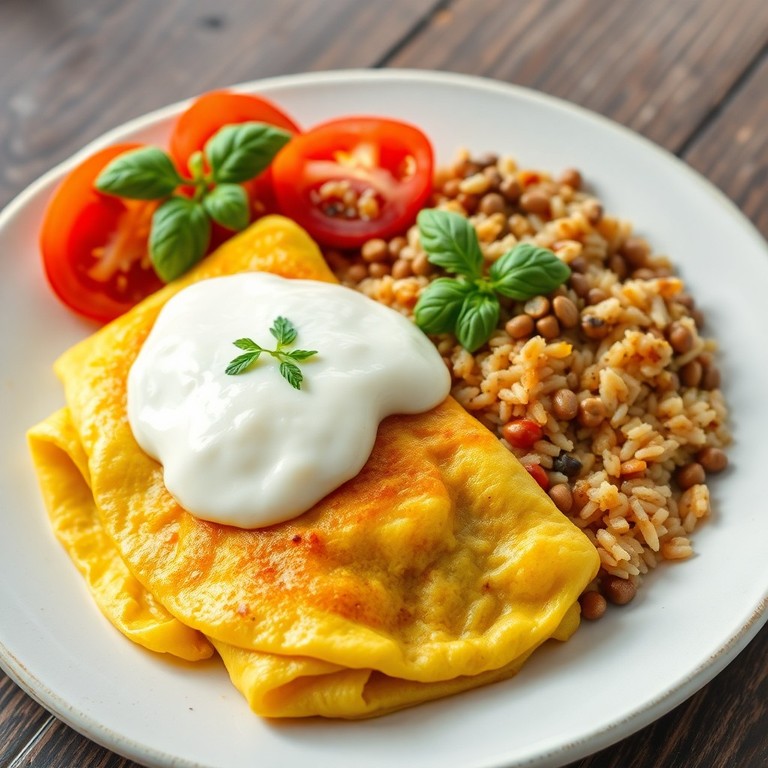 Un desayuno nutritivo que combina huevos esponjosos con queso fundido, acompañado de un arroz con lentejas aromatizado con especias mediterráneas. Este plato ofrece una mezcla equilibrada de proteínas, carbohidratos y sabores frescos para un inicio de día energizante y delicioso.