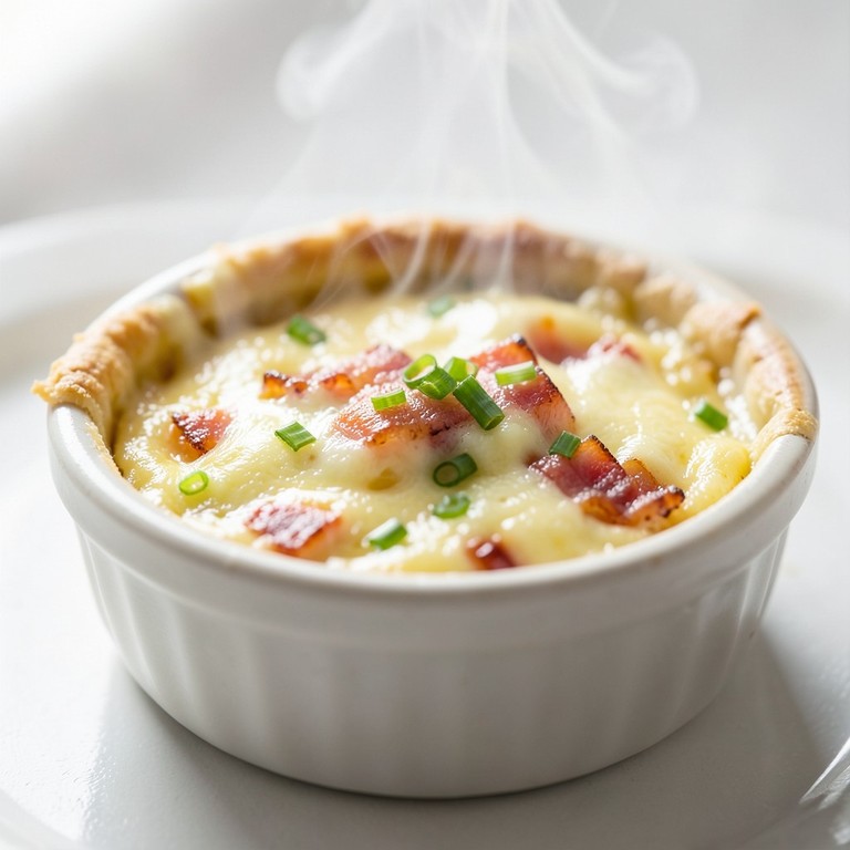 A quick and easy take on the traditional French quiche, featuring savory bacon, nutty Gruyère, and fresh chives in a fluffy egg custard, perfectly portioned for a single serving.