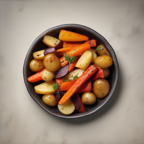 A delicious and colorful medley of roasted carrots, potatoes, and tomatoes.