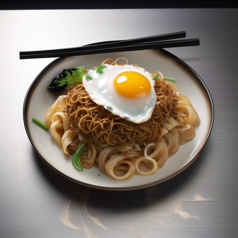 Chinese-Japanese Style Italian Pasta with Oyster Sauce, Onions, and Crispy Fried Egg
