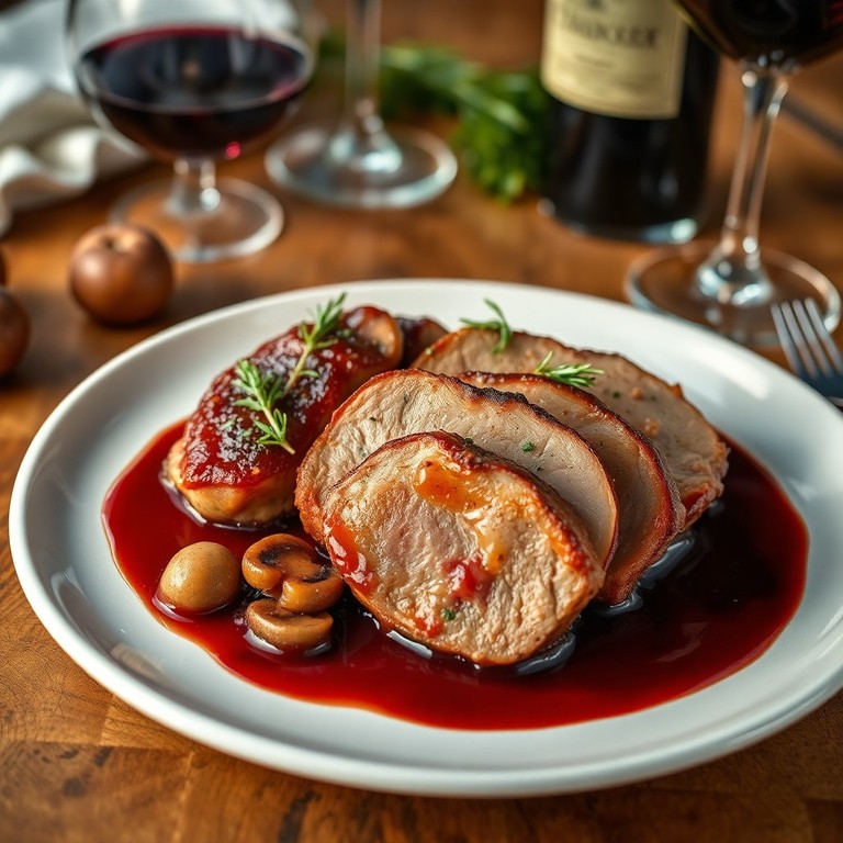Schweinemedaillons im Rotweinsud mit Pilzen