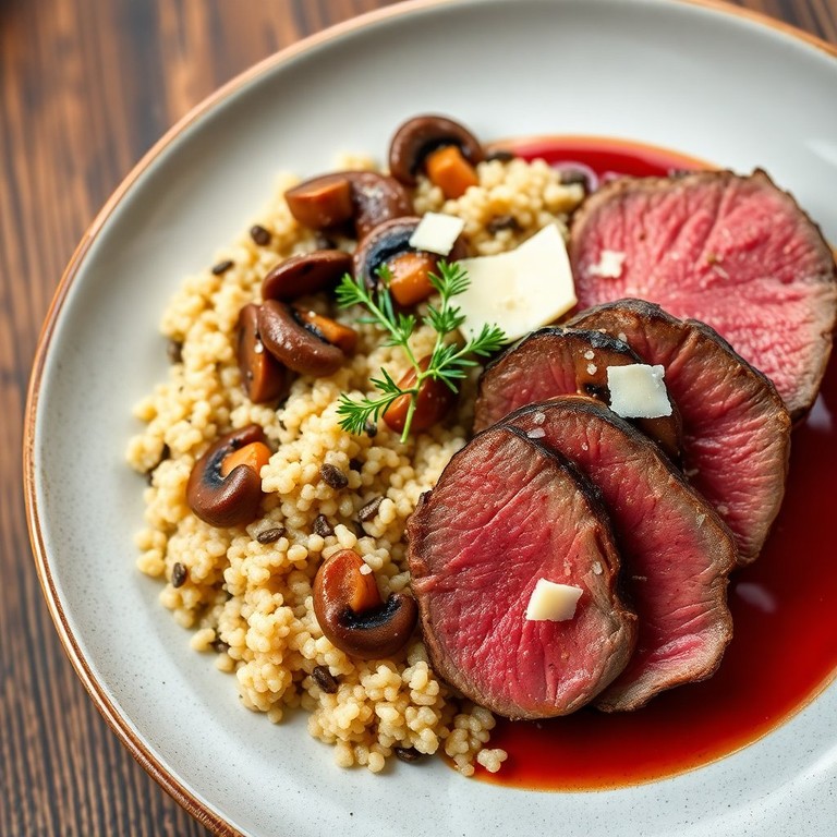 Quinua con Setas Salteadas y Reducción de Vino Tinto con Carne de Res a la Técnica Vanguardista