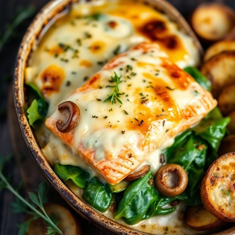 Gratin de Portobello et Saumon sur Lit d'Épinards