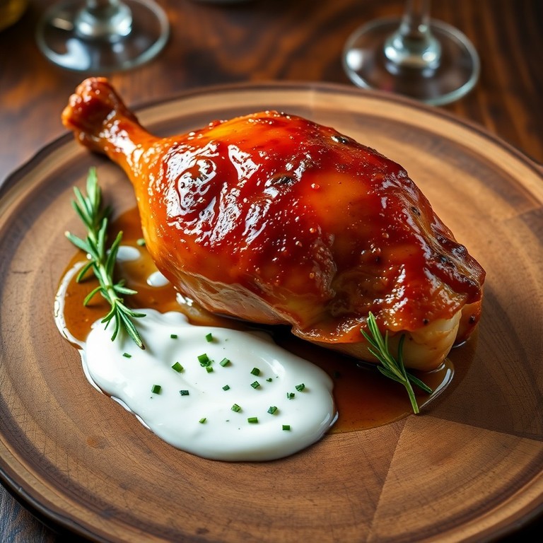 Perna de Frango Glaceada com Whisky e Molho Cremoso de Iogurte