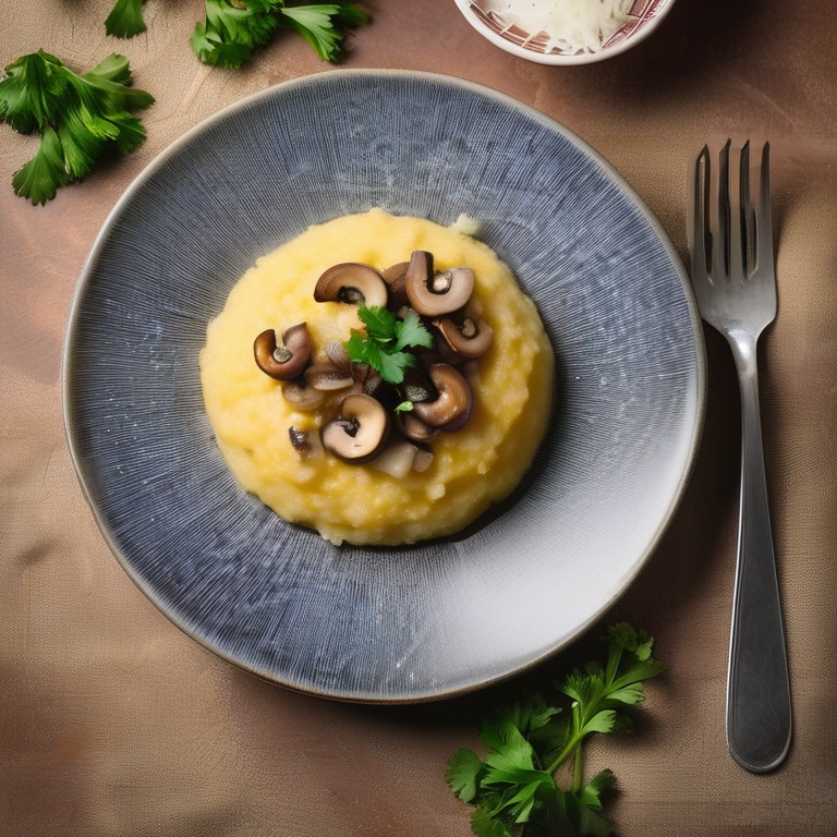 Gebratenes Kabeljaufilet mit Polenta und Pilz-Zwiebel-Sauce