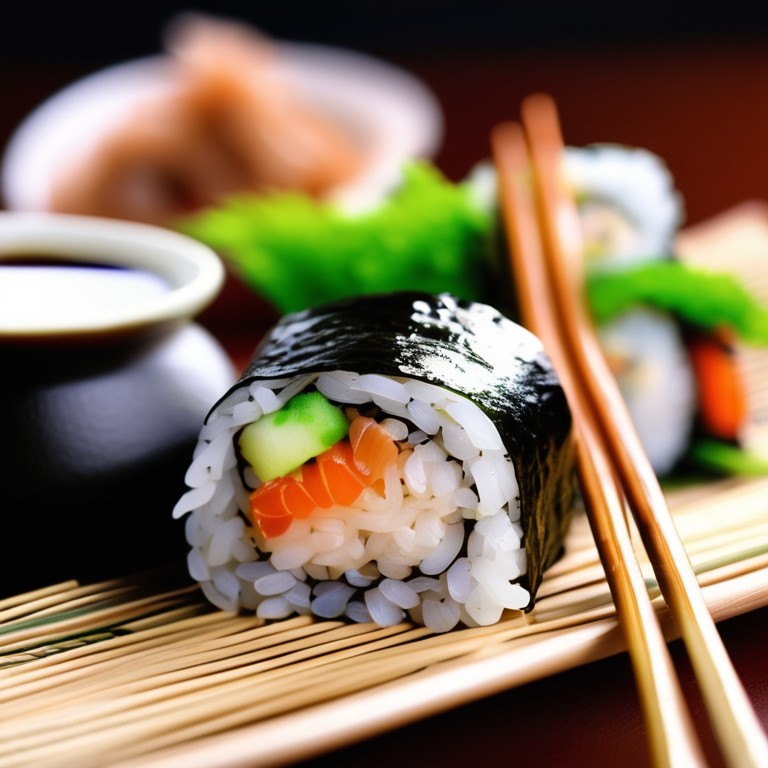 Delicious sushi roll filled with flavorful enoki mushrooms, wrapped in seasoned sushi rice, and served with soy sauce and wasabi.