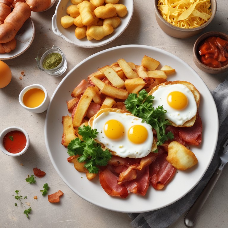 Una deliciosa combinación de huevos, bacon crujiente y patatas fritas como acompañamiento. Perfecto para un desayuno o brunch reconfortante.