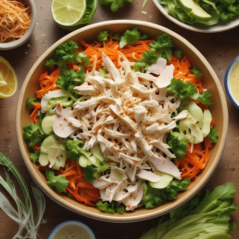 Una ensalada fresca y nutritiva que combina pollo deshebrado con vegetales crujientes, ideal para un almuerzo ligero o una cena rápida.
