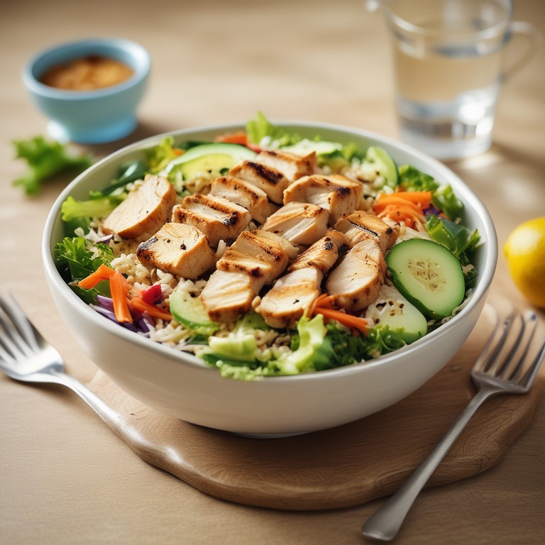 Esta ensalada fresca combina la suavidad del pollo a la parrilla con la textura del arroz integral y la frescura de las verduras, creando un plato saludable y delicioso.