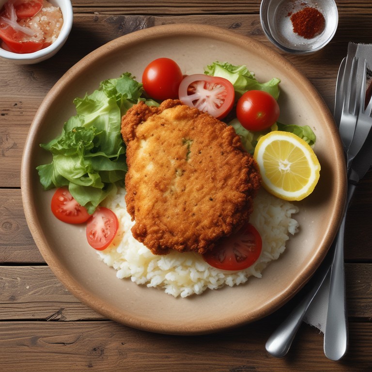 Una deliciosa milanesa de pollo acompañada de una fresca ensalada y arroz, perfecta para una comida equilibrada y sabrosa.