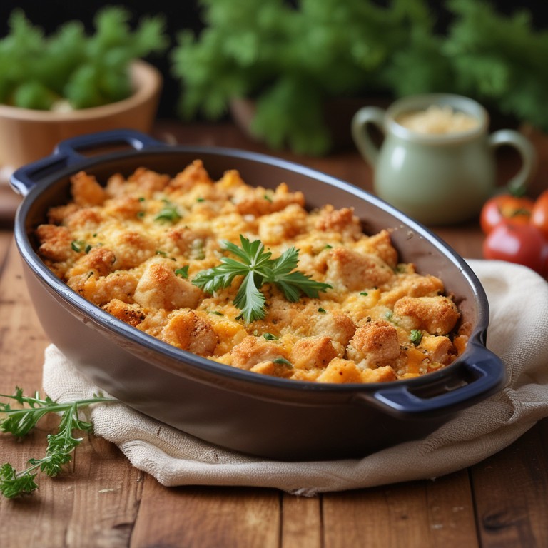 This comforting chicken casserole is a five-star favorite, inspired by grandma's classic recipe. It's a hearty dish filled with tender chicken, rice, and vegetables, all enveloped in a creamy sauce and topped with melted cheddar cheese and crispy breadcrumbs. Perfect for family gatherings or a cozy dinner at home.