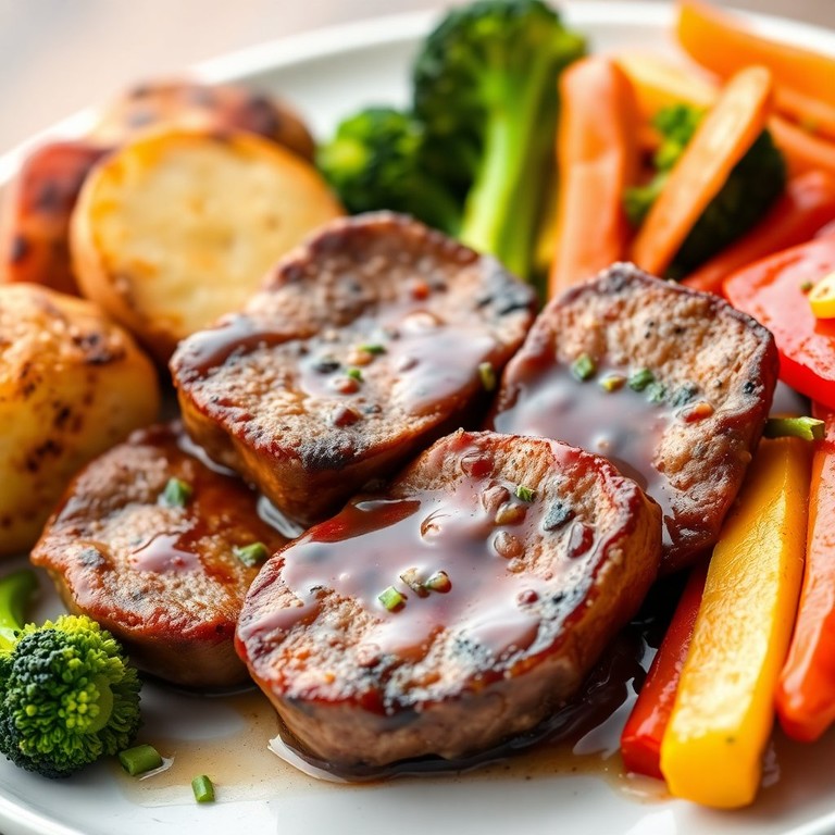 Medallones de res tiernos servidos con papas y verduras asadas al estilo teriyaki, una combinación perfecta de sabores y texturas que deleitará tu paladar.