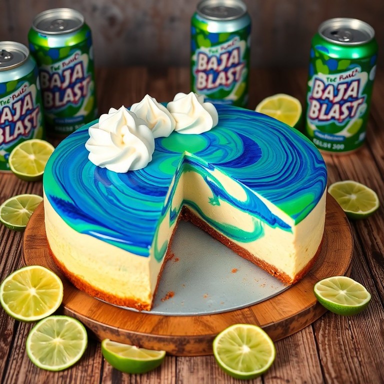 A luscious cheesecake with a colorful Baja Blast swirl, bringing a fun twist to your dessert table.