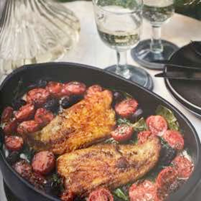 Poisson rôti aux épinards à la crème, petites tomates et olives