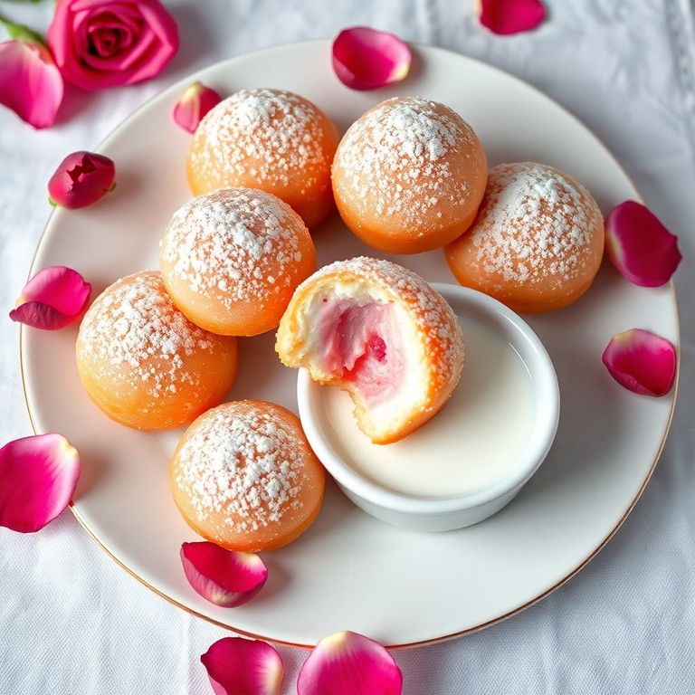 Savor the exotic aroma of these rose-flavored mochi donuts, offering a chewy texture and a unique twist on a classic treat.