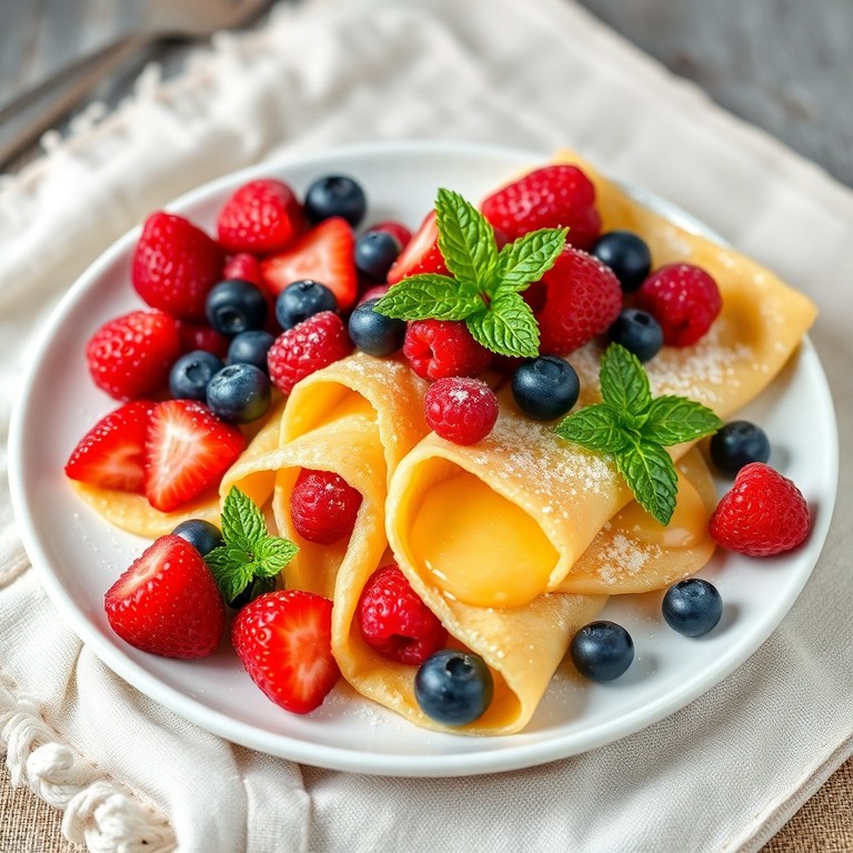 Delicadas crepes francesas rellenas de una suave crema de limón y cubiertas con frutos rojos frescos. Un postre elegante y fácil de preparar, perfecto para cualquier ocasión.