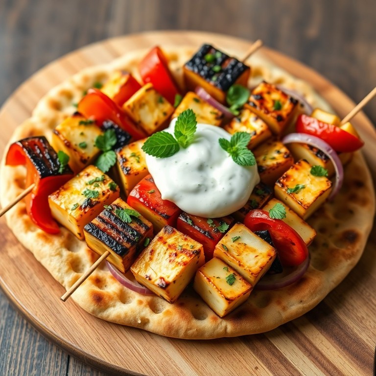 Gegrilde halloumi en groentespiesen geserveerd op warme naan, besprenkeld met een frisse munt-yoghurt dressing. Ideaal als lichte lunch of vegetarisch hoofdgerecht, klaar in 25 minuten.