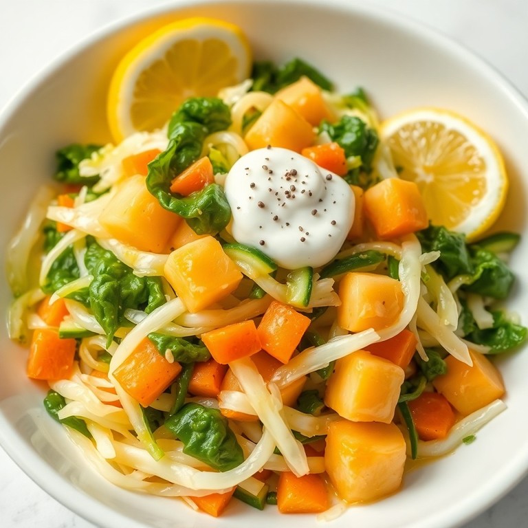 Um prato saudável e leve que mistura repolho branco, chuchu e folhas de couve, cozidos com cebola, sal e pimenta do reino, ideal para acompanhar carnes ou servir como prato principal.