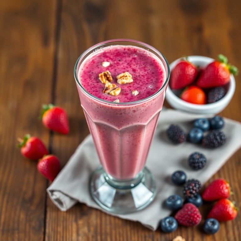 Un smoothie nutritivo que combina avena remojada, frutos rojos frescos y nueces tostadas, ideal para un desayuno rápido, saludable y lleno de antioxidantes.