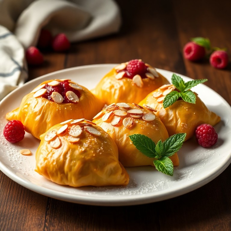 Värmda små smördegsknyten fyllda med söt och syrlig hallonsylt, toppade med skivade mandlar som ger en härlig krispig textur. Dessa knyten är perfekta som ett snabbt tilltugg eller en läcker dessert vid fikabordet. Enkel att förbereda och alltid uppskattad för sin kombination av smörig smördeg och fruktig fyllning.