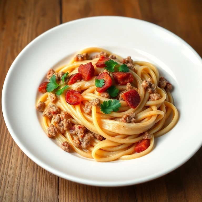 En rik och krämig pasta med saftig köttfärs och knaprig bacon, perfekt för en snabblagad middag som mättar hela familjen.
