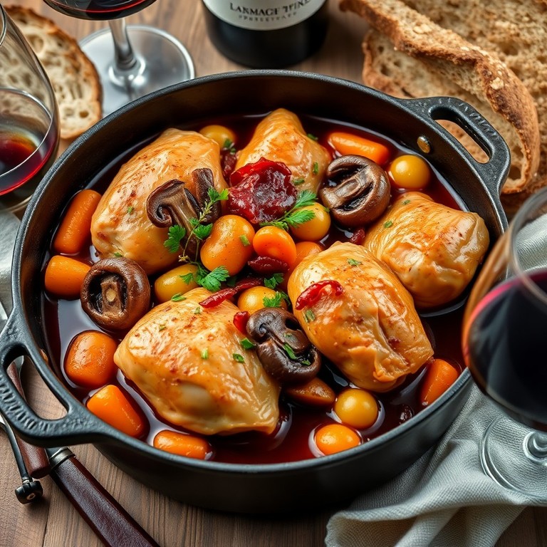 En klassisk fransk kycklinggryta där kyckling långsamt kokas i rödvin med svamp, lök och sidfläsk. Perfekt för en elegant middag à la "Halv åtta hos mig".